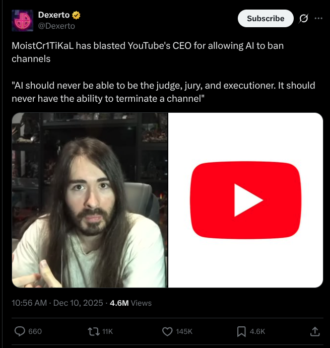 It seems like AI is causing more problems than it solves. Now it is hitting YouTubers with AI moderation that is capable of terminating entire channels.